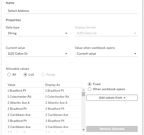 In this Viz, the property details, plat URL link, images of the property, and ESRI view are dependent on a single value. In Tableau, a parameter can be across sheets and can also be used within a filter by setting a formula with the parameter as a control. The parameter in this Viz is named Select Address and serves as the control for the rest of the data. The parameter values are based on the Situs Street values that were gathered from a Python script. Here, the values are Fixed since I do not intend to update the list.
