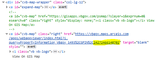 In the dashboard, the ESRI view is loaded by modifying the GET parameters of the URL called by the Virginia Beach Assessor's site. Specifically, the GPIN needs to be pass as the GET variable to the URL.