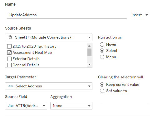 To update the property details, the Select Address parameter needs to change when selecting an address on the Heat Map. Adding a Parameter Action based on the Address field of the Heat Map updates the Select Address parameter. That, in turn, updates the filter of all the sheets using the conditional formula. The result is each sheet displayed in the Dashboard reflects the data specific to the address selected in the Heat Map.