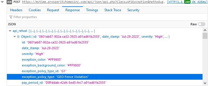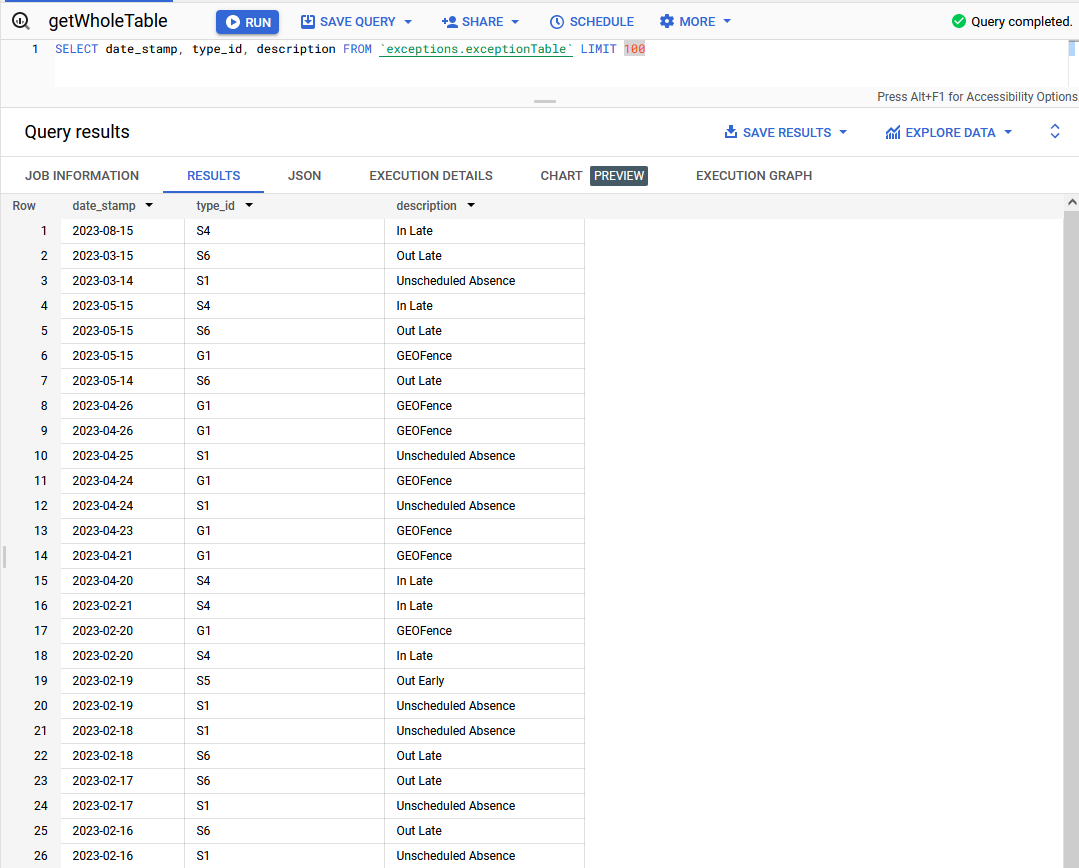 First, I explore the PostgreSQL database model to see if the needed fields are available for extraction. Specifically, I look for the data that include the exception codes, the description of the code, and the date the exception occurred. The database schema includes the code IDs and the date but there is nothing for description.