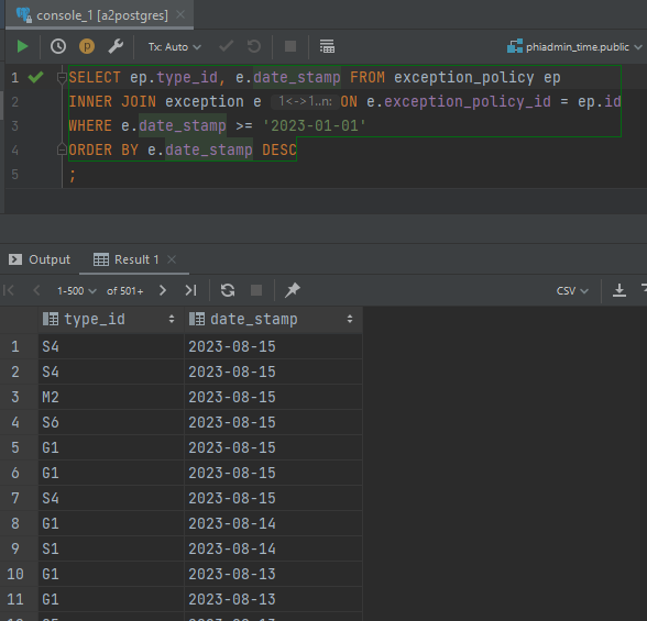 statement = "SELECT to_char(e.date_stamp, 'YYYY-MM-DD'), ep.type_id FROM exception_policy ep " \