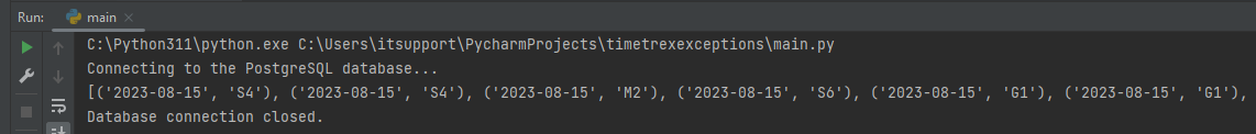 Using the psycopg2 package, I connect to the PostgreSQL database. I execute the same query as I did in DataGrip and save the records.