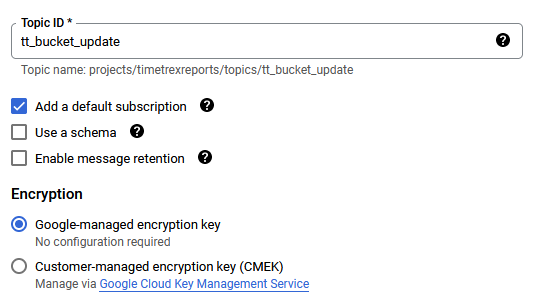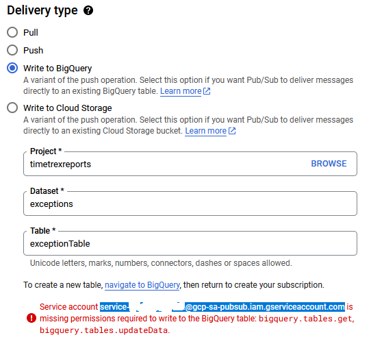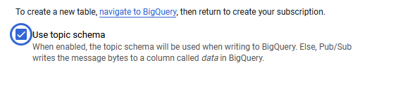 The BigQuery table is ready, and the topic has been created. I change the default subscription to push to BigQuery via its setting in the Google console.