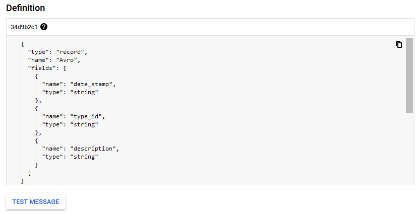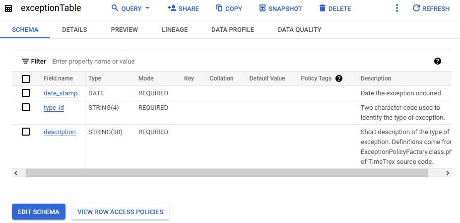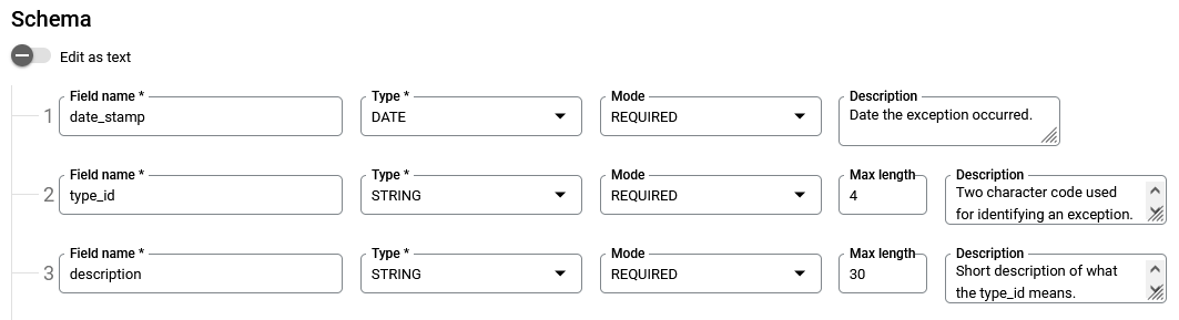 df['description'] = df['type_id'].map(listOfCodes)Next, I create the BigQuery schema to match that of the list of Python dictionaries created from the data extract and transformation.