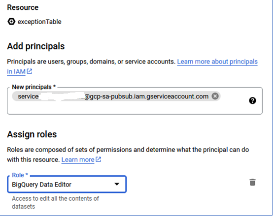 Since this is being called from Pub/Sub, the service account needs to be authorized to handle creating data in the BigQuery table.