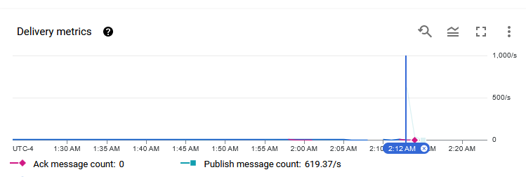 After the full push, the metrics indicate that Pub/Sub can easily handle over 600 messages per second.